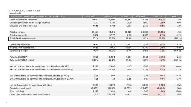 净利润创下年内最低,为18.5亿美元,同比下滑44%,利润率为7.9%。毛利率方面较上季度微弱下滑,为17.9%,汽车毛利率下降为16.3%。总之,特斯拉曾经超过25%的傲人毛利率正在一去不复返。
