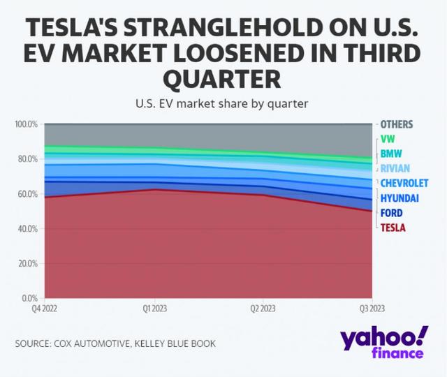 面对一帮卷王,即使是特斯拉也无法守住份额。“凯利蓝皮书”发布的报告称,美国第三季度电动汽车销量超过31.3万辆,比去年同期增长近50%。电动汽车在美国汽车市场中的份额达到7.9%,创历史新高。但在市场大好的情况下,特斯拉的份额出现下滑,从接近三分之二,下滑到了5成。与此同时,日产、福特、奔驰等对手的销量都出现明显提升。