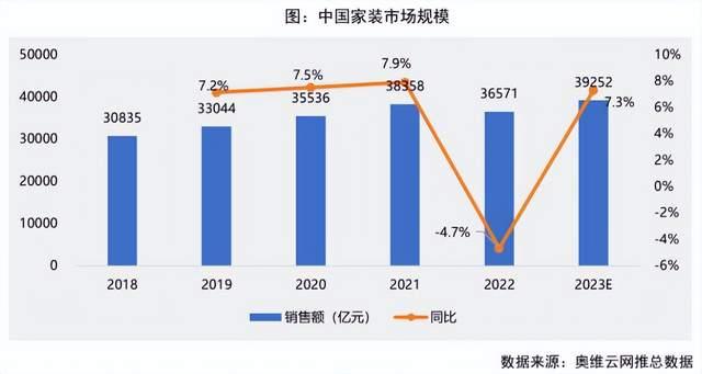 根据第三方统计数据显示,2018年全国家装市场规模首次突破3万亿,到2021年全国家装市场规模增速达到近五年来的顶点7.9%,预计2023年全国市场规模将达39252亿元,同比增速回弹至7.3%。