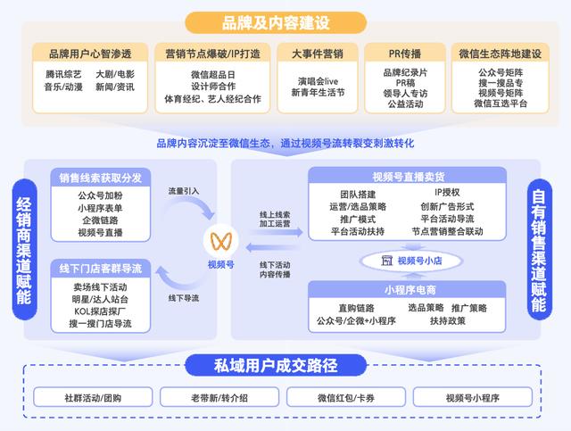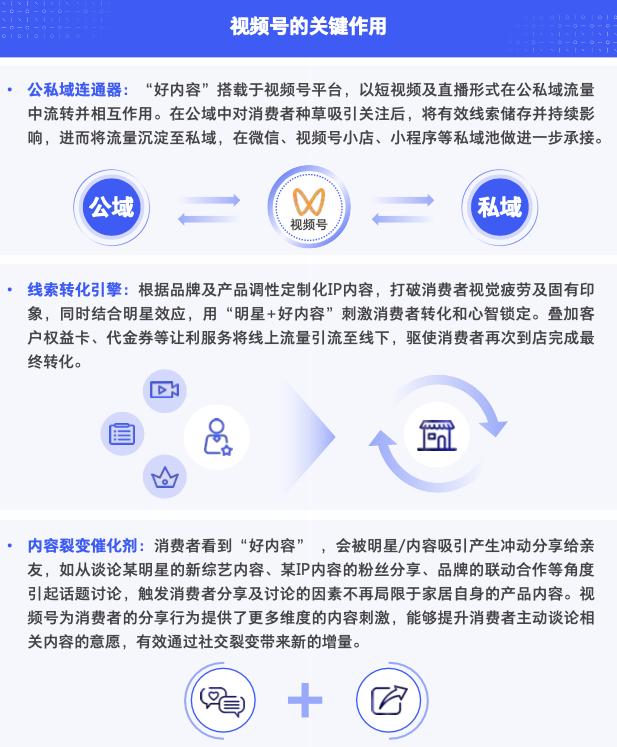 而作为兼具私域沟通、内容分享双重属性的微信,品牌可以在微信生态中通过打造“好内容”沉淀有效线索,又可以利用视频号流转“好内容”,持续影响并促进成交。正如白皮书中阐述到,视频号承担着“公私域连通器”、“线索转化引擎”和“内容裂变催化剂”的作用: