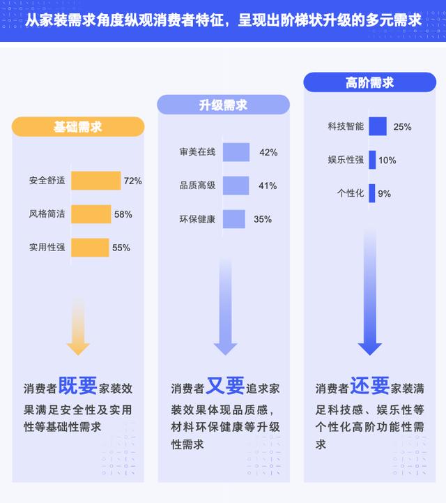 在国内家装市场,消费者对于家装的需求也开始分级,呈现出基础、升级、高阶三级状态。除了追求家装的基本质量及安全性,消费者在审美、功能性等层面也产生了越来越多个性化的想法及要求。