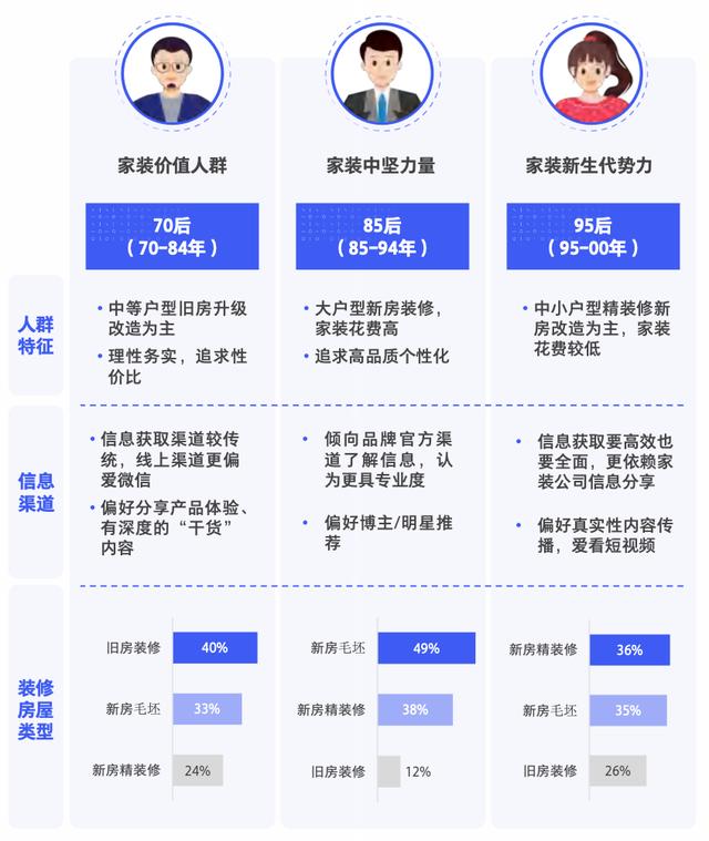 白皮书也将家装消费主流分群,按代际划分为“70后价值人群”、“85后中坚力量”和“95后新生代势力”: