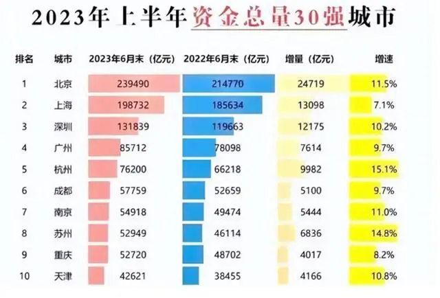 苏州的资金增量也高达6800多亿,远超重庆和天津。值得一提的是,苏州的资金总量实际增速达到了14.8%,仅次于杭州,在前十强城市中排名第二。