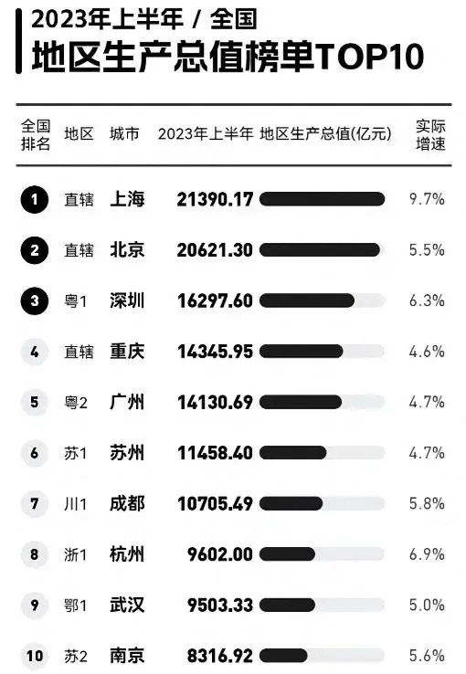 但是考虑到去年同期上海的增速为-5.7%,基数相对较低,今年的大幅增长也并不出人意料。在全国城市GDP前十强排名中,苏州如一颗冉冉升起的明星,稳坐全国第一的位置。