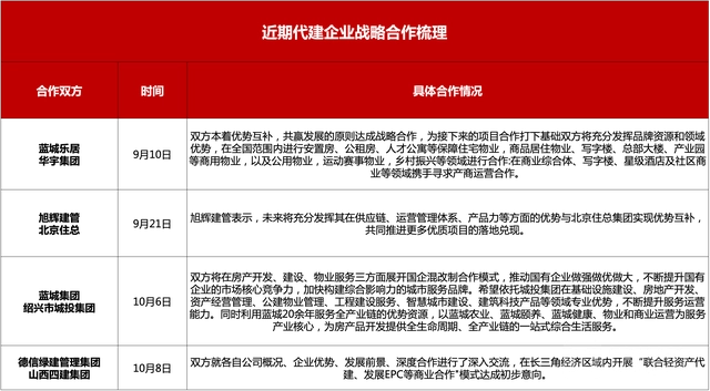 今年以来,东原地产明确表示发力代建业务,7月与蓝绿双城达成战略合作,截止目前已新拓5个代建项目,新增建面约64万方;8月,滨江集团在原有地产开发基础上,宣布重返代建赛道;9月,招商蛇口组建代建团队,明确轻资产赛道,积极主动参与代建业务。代建市场再次扩容。