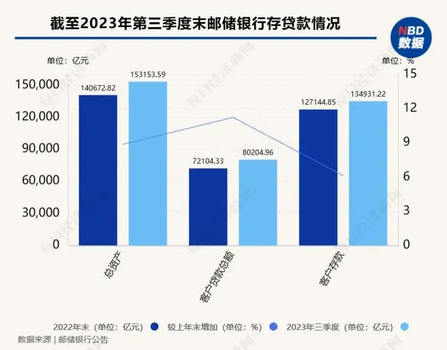 资产方面,截至今年9月末,邮储银行资产总额达15.32万亿元,较上年末增长8.87%,其中客户贷款总额达8.02万亿元,较上年末增长11.23%。数据显示,前三季度邮储银行客户贷款增加8100.63亿元,同比多增1122.93亿元,增量创历史同期新高。