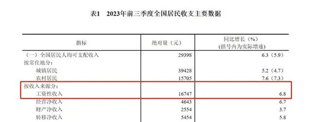 按收入来源分,前三季度,全国居民人均工资性收入16747元,增长6.8%,占可支配收入的比重为57.0%。