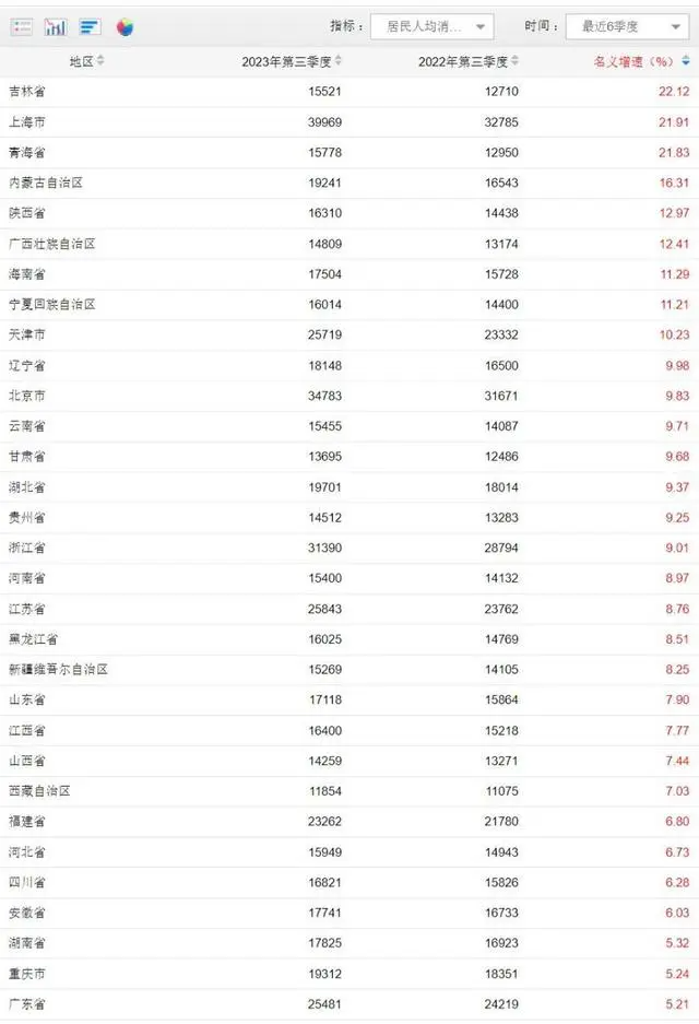 值得一提的是,31省份前三季度人均消费支出同比均实现正增长,其中,吉林、上海、青海、内蒙古、陕西、广西、海南、宁夏、天津9省份名义增速均超过10%,吉林人均消费支出名义增速高达22.12%,居全国首位。