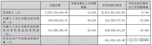 其中,公司第三季度营收同比下降13.24%至42.51亿元,归母净利润同比下降38.22%至1.50亿元。单季度来看,三季度收入降幅环比拉大,净利润降幅环比有所收窄。