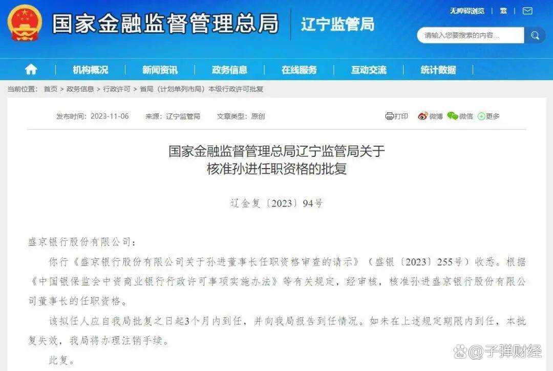 11月6日,国家金融监督管理总局辽宁监管局发布批复,核准孙进盛京银行董事长的任职资格。该拟任人应自该局批复之日起3个月内到任,并向该局报告到任情况。
