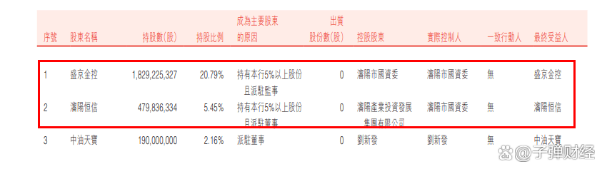 截至今年6月,盛京金控持有盛京银行20.79%的股份,为其第一大股东;沈阳恒信国有资产经营集团有限公司持股5.45%,为其第二大股东,两大股东实际控制人均为沈阳市国资委。