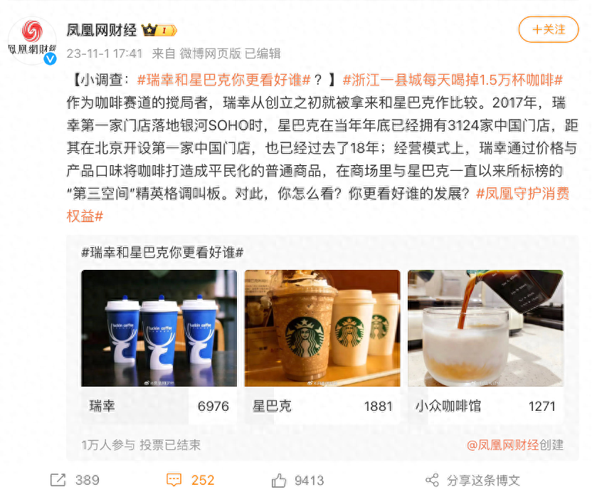 平价、性价比,无疑能够吸引更多人的选择。凤凰网财经在微博发起的#瑞幸和星巴克你更看好谁#小调查显示,在1万人投票中,有69.8%投给了瑞幸,近18.8%投给了星巴克,还有12.7%投给了小众咖啡馆。