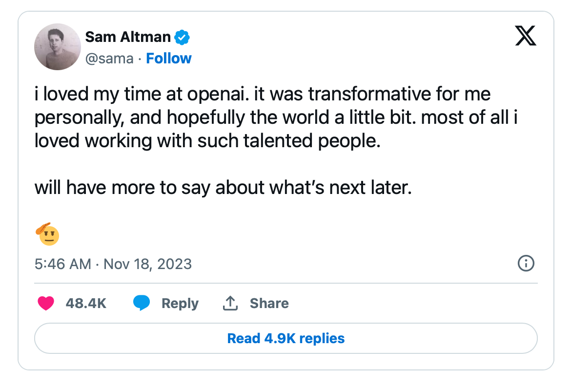 除了声明中所述之外,目前尚不清楚OpenAI董事会做出这一决定的原因。奥特曼在X的帖子中写道:“我喜欢在OpenAI的时光。这对我个人来说是变革性的,希望对世界也有一点变革。最重要的是,我喜欢与这些才华横溢的人一起工作。稍后将有更多关于接下来的事情要说。”