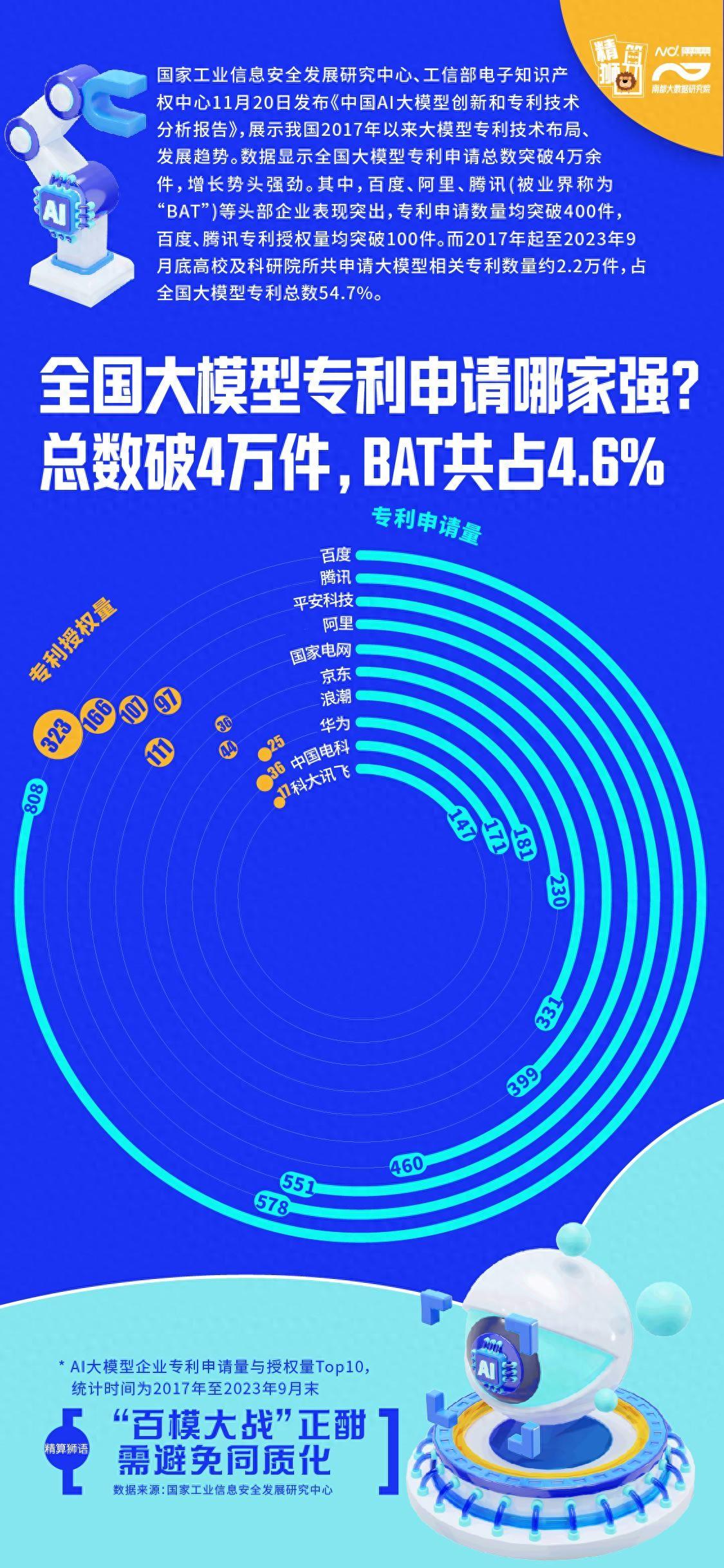 大模型专利申请谁强?总数破4万件,百度腾讯阿里占4.6%