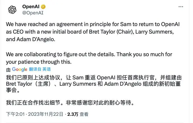 在经历一段时间的谈判后,当地时间11月21日深夜,人工智能开发机构OpenAI宣布,已经原则上达成协议,联合创始人山姆·奥特曼重返公司担任CEO,“并组建由布雷特·泰勒(pet Taylor)(主席)、拉里·萨默斯(Larry Summers)和亚当·德安杰洛(Adam D’Angelo)组成的新董事会。我们正在合作找出细节。非常感谢你对此的耐心等待。”