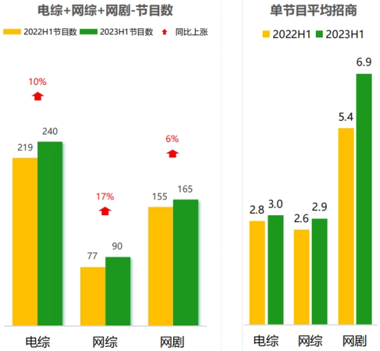 2023年,随着市场环境的回暖,长视频平台不管在内容数量上、还是招商表现上,均有了明显的提升。击壤科技《2023年H1综艺节目植入半年报》显示,电综、网综、网剧客户数同比均增,综艺、网剧平均招商全面增长。
