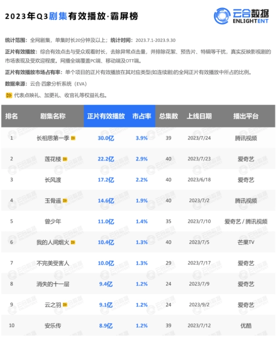 据云合发布的2023Q3全网剧集有效播放榜TOP10中,独播剧共9部,其中爱奇艺5部,腾讯视频2部,优酷和芒果TV各一部。