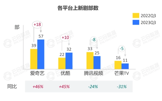 其中,爱奇艺上新国产剧集57部,同比增加18部;优酷上新32部,同比增加10部;腾讯视频上新国产剧集25部,同比减少8部;芒果TV上新11部,同比减少5部。
