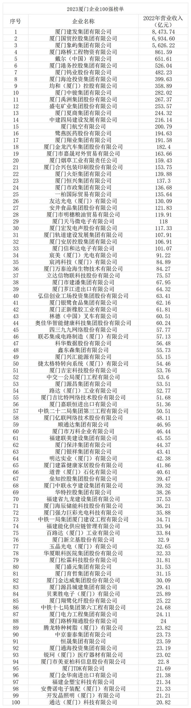 排在榜单5-10位的依次是戴尔(中国)、厦门港务控股集团、厦门钨业、厦门海沧投资集团、均和(厦门)、厦门中骏集团。在同时出炉的“制造业企业10强”,戴尔(中国)高居第一,营收达到651.61亿元。