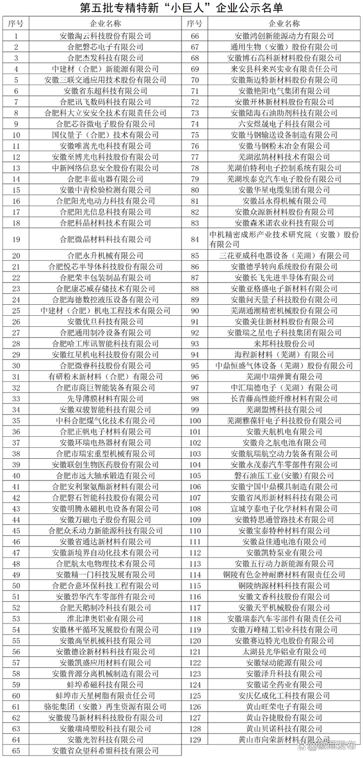 近日,第五批国家级专精特新“小巨人”企业名单正式公布,全国共认定了3654家,安徽省共129家企业上榜。