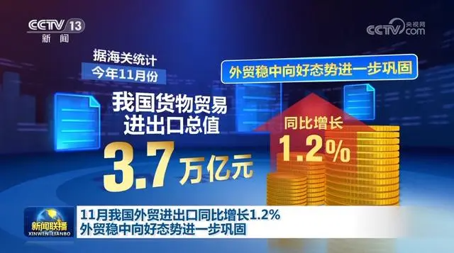 导读:海关总署12月7日对外公布,今年11月份,我国货物贸易进出口总值3.7万亿元,进出口同比增长1.2%,外贸稳中向好态势进一步巩固。