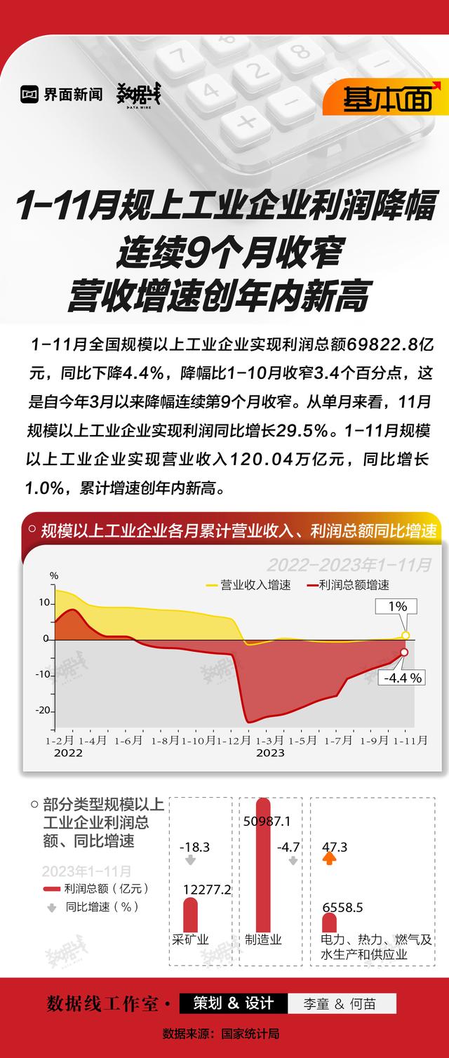 导读:1-11月规上工业企业利润降幅连续9个月收窄,营收增速创年内新高。