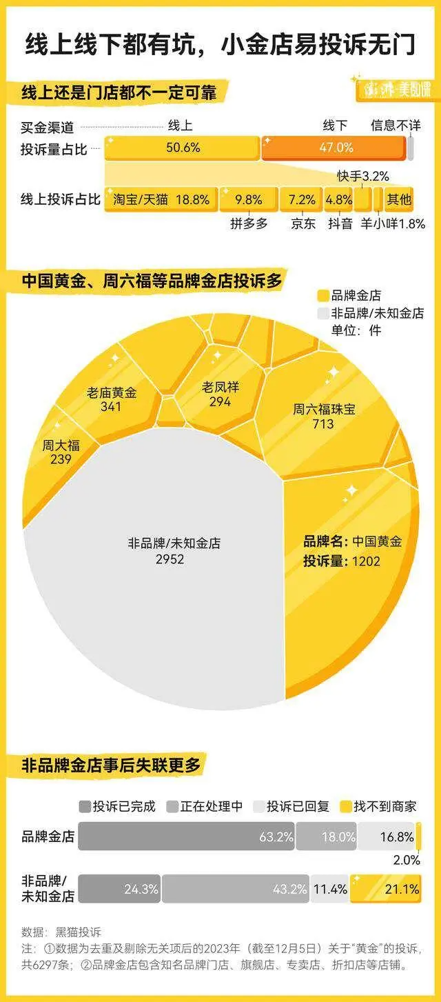 而根据此前澎湃新闻整理的图表可以看到,购买金饰时,商品本身问题,引发消费者集中吐槽的问题主要是含金量不足、掉色变形等,在交易中遇到问题较多的是一口价、虚假/不开发票等问题,而在售后上,商家跑路、退换货难也成为重灾区。