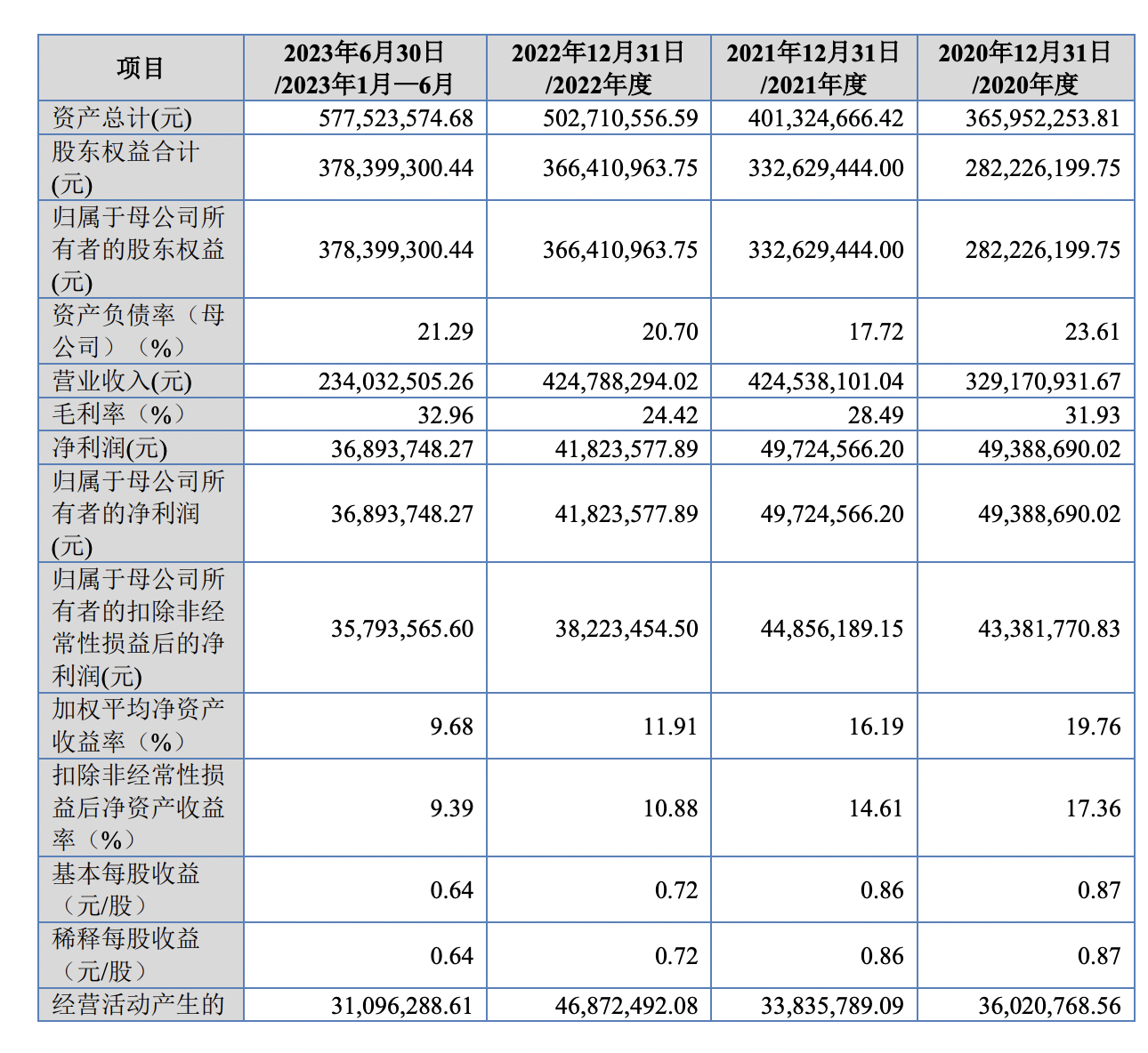 业绩方面,2020-2022年及2023年1-6月,天威新材营业收入分别为3.29亿元、4.25亿元、4.25亿元和2.34亿元;净利润分别为4938.87万元、4972.46万元、4182.36万元和3689.37万元。