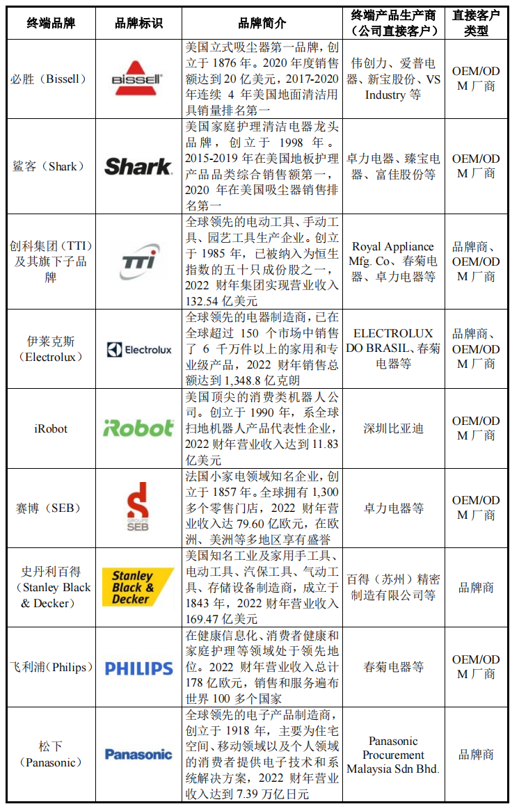 星德胜微特电机产品在吸尘器细分领域中市场占有率较高,产品广泛应用于包括必胜(Bissell)、鲨客(Shark)、创科集团(TTI)、伊莱克斯(Electrolux)、百得、松下、日立、飞利浦、LG、美的、德尔玛、科沃斯、小米、石头科技等国内外知名终端品牌电器产品。
