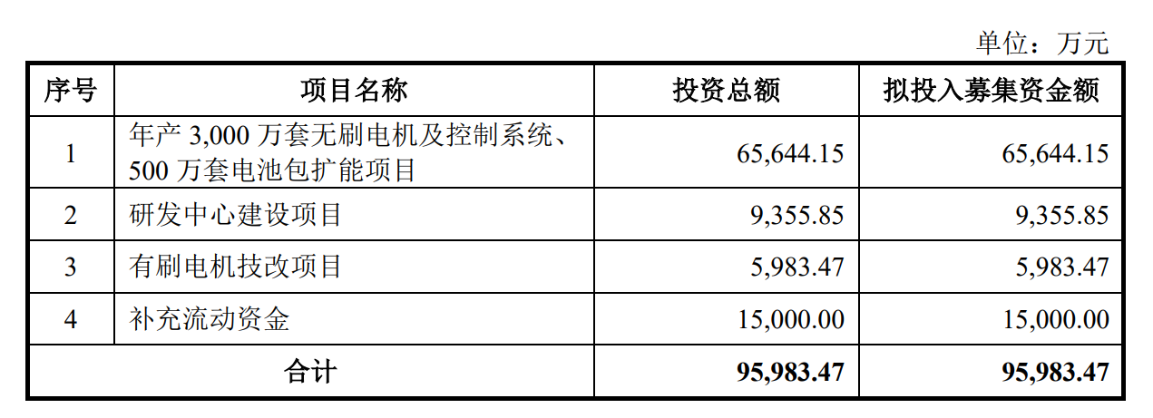 星德胜本次拟投入募集资金额共计9.6亿元,用于年产3000万套无刷电机及控制系统、500万套电池包扩能项目、研发中心建设项目、有刷电机技改项目及补充流动资金。