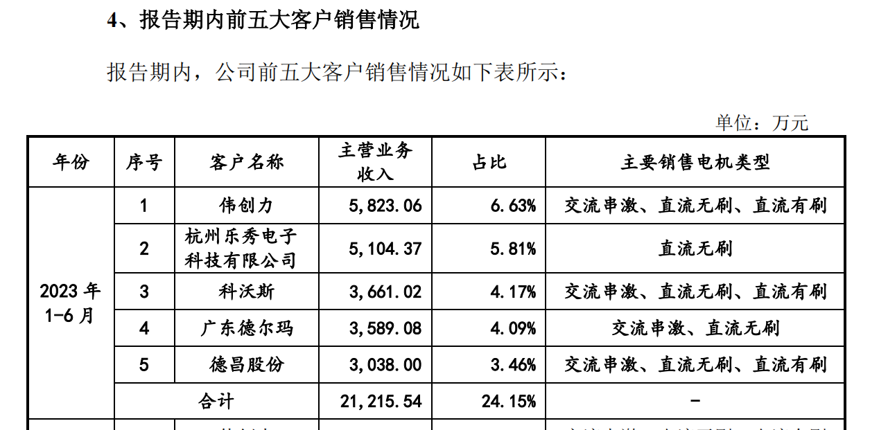 2023年1-6月,星德胜前五大客户分别为伟创力、杭州乐秀电子科技有限公司、科沃斯、广东德尔玛、德昌股份,销售占比分别为6.63%、5.81%、4.17%、4.09%、3.46%。
