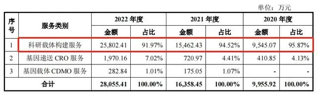 现阶段,云舟生物主营业务包括了“科研载体构建服务”、“基因递送CRO服务”及“基因载体CDMO服务”三个板块。其中,科研载体构建服务占主营业务收入一直在90%以上。