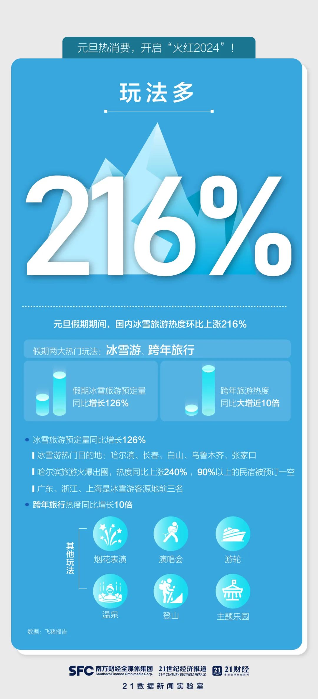 而在温暖的南方,不管是国内的广东、海南、香港、澳门,还是国外的泰国曼谷以及新加坡等地,跨年烟火表演或者跨年演唱会等丰富活动都吸引了大量年轻人。马蜂窝大数据显示,焰火和音乐是迎接新年氛围的标配,2024元旦期间,“跨年烟花”、“跨年演唱会”热度大幅上涨187%和249%。携程数据显示,元旦前往香港的订单量同比增长603%。