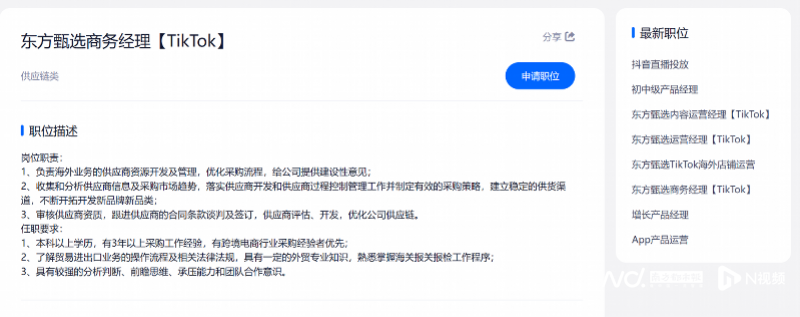 此外,对于出海业务,临时股东大会透露,在海外供应链方面可能会与TikTok进行合作。南都记者查询获悉,东方甄选的招聘页面显示,在招职位中包括东方甄选TikTok海外店铺运营、 东方甄选内容运营经理【TikTok】、东方甄选商务经理【TikTok】等。其中东方甄选商务经理【TikTok】的工作内容包括,负责海外业务的供应商资源开发及管理,优化采购流程,给公司提供建设性意见,集和分析供应商信息及采购市场趋势,落实供应商开发和供应商过程控制管理工作并制定有效的采购策略,建立稳定的供货渠道,不断开拓开发新品牌新品类等。
