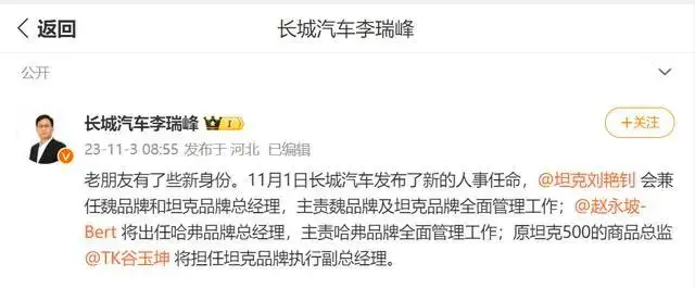 11月3日,长城汽车CGO李瑞峰在社交平台上表示,长城汽车于11月1日发布了新的人事任命,具体调整包括: