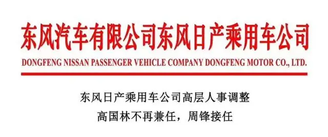 12月6日,东风日产也发布了人事变动通知——周锋任东风汽车有限公司副总裁、东风日产乘用车公司副总经理,高国林不再兼任东风日产乘用车公司副总经理职务,继续担任东风汽车有限公司副总裁。