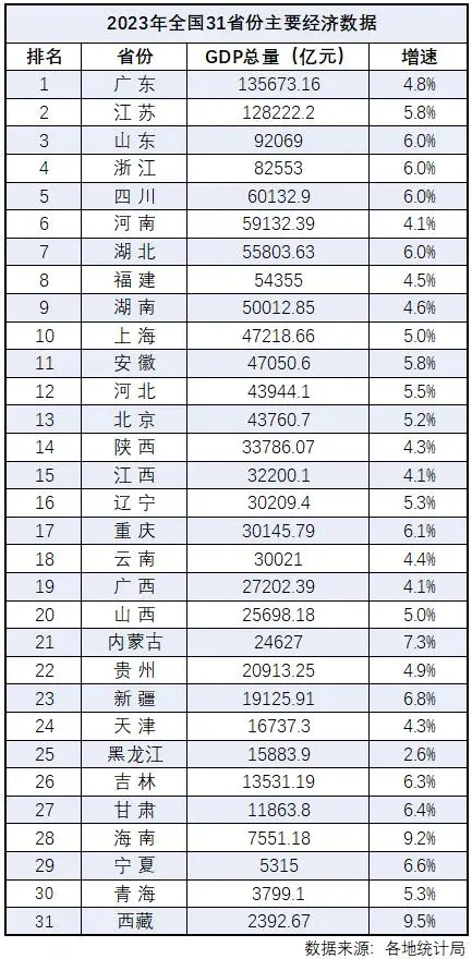 随着新疆发布2023年经济运行情况,全国31个省(区、市)2023年全年GDP相关数据已全部出炉。