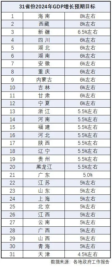 据潮新闻梳理,大多数省份不低于5%,其中,海南、西藏均将2024年增速目标设为8%左右,为全国最高。