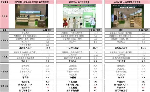 《天下网商》走访了杭州奥体印象城的NAILOOK门店,通过工作人员了解到一些经营细节和他们的业绩预估。这是一家位于商场中岛的店铺,这类店铺的首期开店投入在12万左右,包括货品费用、店铺装修、设备物料、货品投入等,刨除所有支出,他们预估年度营收在102万左右,分摊到每个月,店铺营收为8.5万。