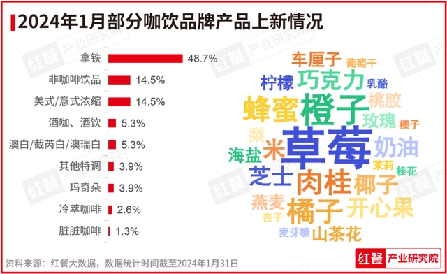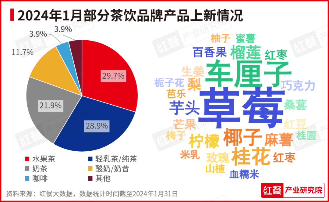 2024年1月,红餐产业研究院对茶饮、咖饮、面包烘焙、火锅这四个餐饮品类的头部品牌进行了新品上市情况监测,具体结果如下: