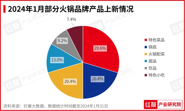 2024年1月,在红餐产业研究院监测的火锅品牌中,有10个连锁火锅品牌共推出了54款新品,较2023年12月的火锅新品数量增长了12.5%。从新品的细分种类来看,当月火锅新品涵盖的种类有火锅锅底、火锅配菜、特色菜品、特色小吃、饮品以及甜品。