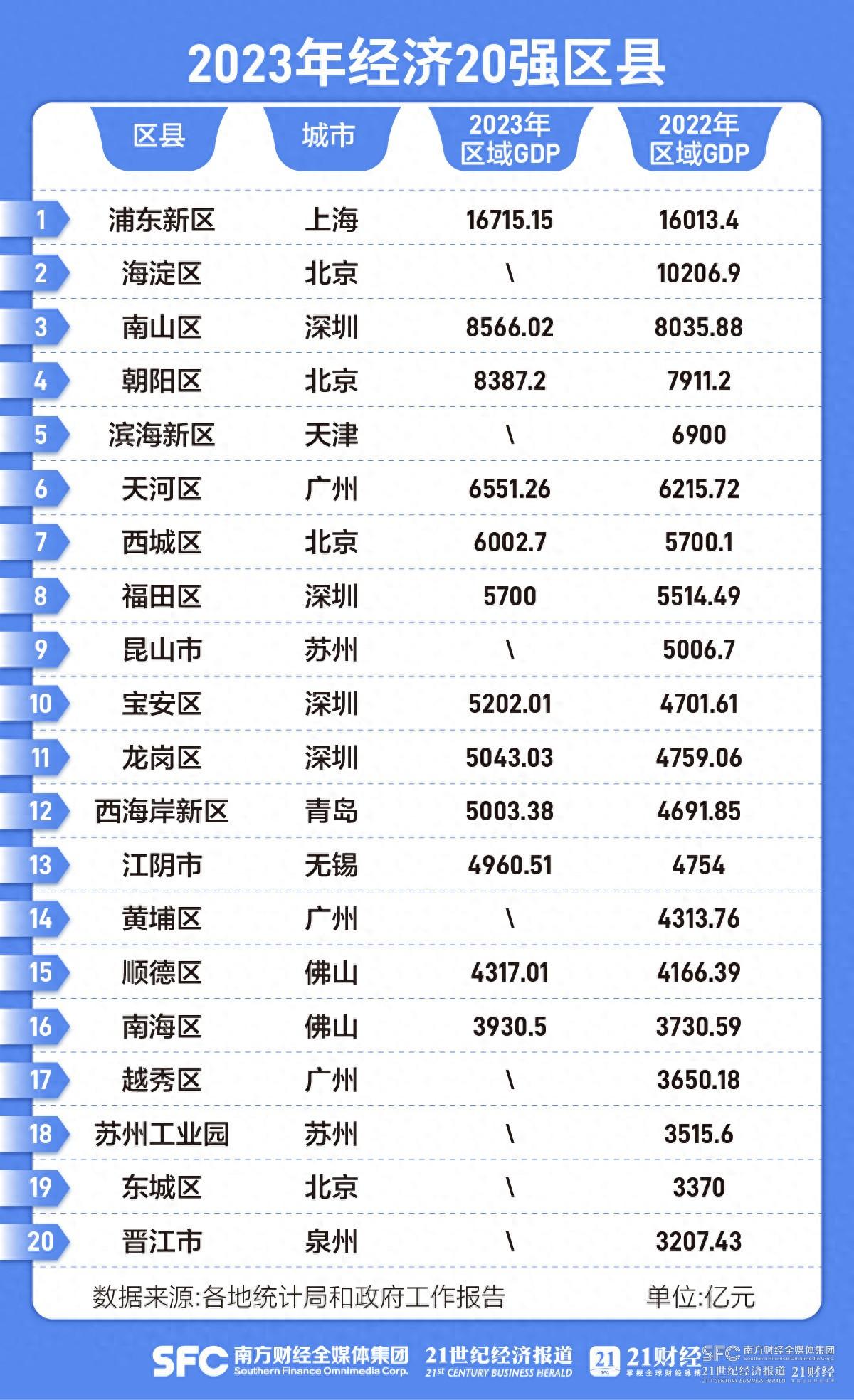 在县域经济,2010年,首个GDP超5000亿元城区——天津滨海新区诞生。随后,上海浦东新区与北京海淀区、朝阳区相继跨过5000亿元大关。