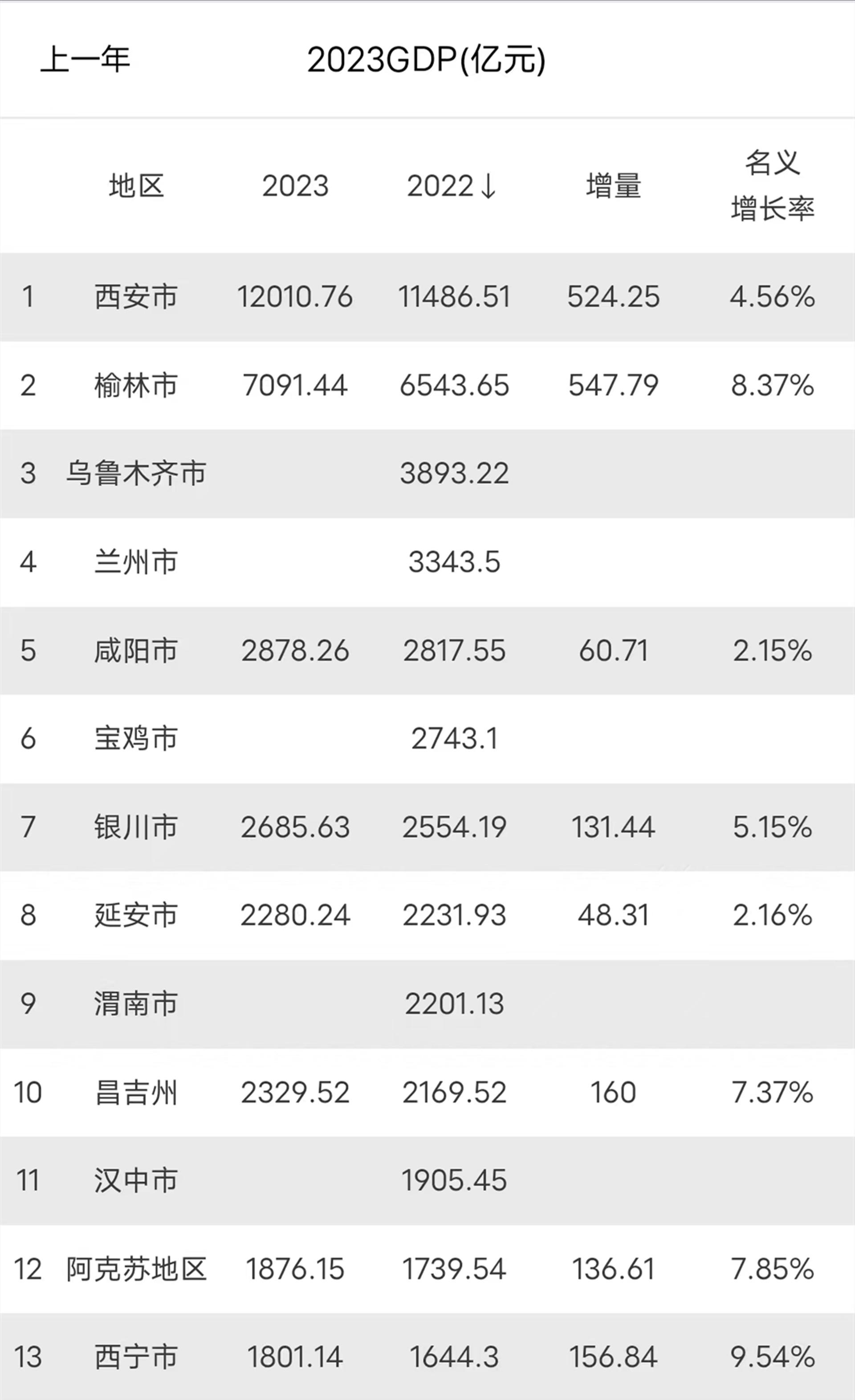 2023年西北GDP十强市出炉:榆林7000亿,银川将超咸阳,汉中无缘