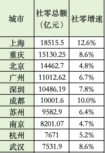 社零总额排名靠前的城市中,除去6个已经突破万亿的城市:上海、重庆、北京、广州、深圳和成都,接下来的四个“万亿消费城市后备军”分别是苏州、南京、杭州、武汉。