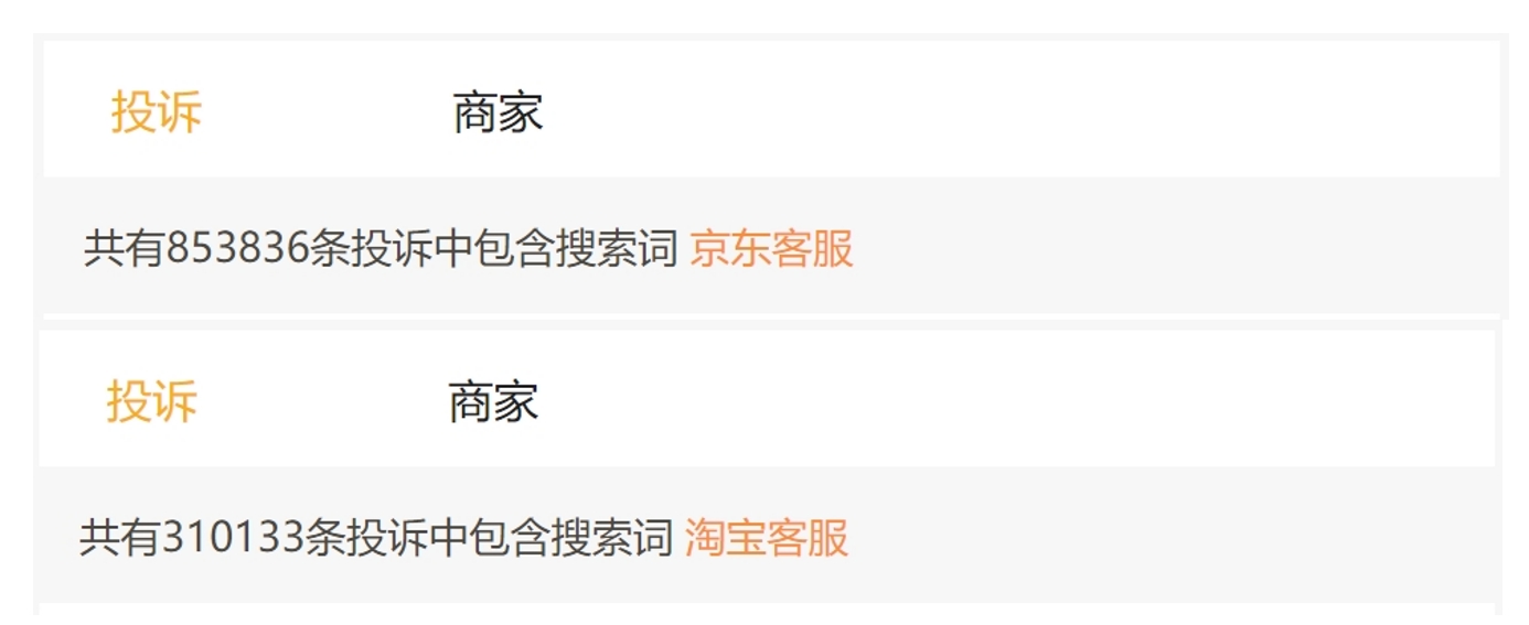 稍微翻阅各大社交网站,就能找到用户对电商平台客服的各种吐槽。在黑猫投诉平台上搜索关键词“淘宝客服”,则能看到超过31万条相关投诉,“京东客服”的搜索结果更是达到惊人的85万条,投诉内容也可以说是五花八门。