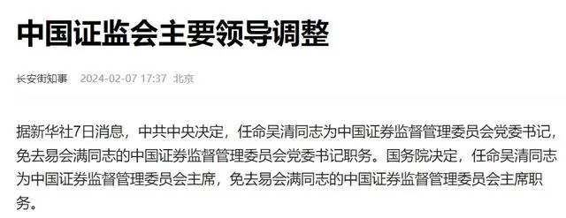 导读:2月7日盘后传来重磅消息,易会满被免去证监会党委书记和主席职务,由吴清接任。至此,证监会迎来了第十任主席正式。