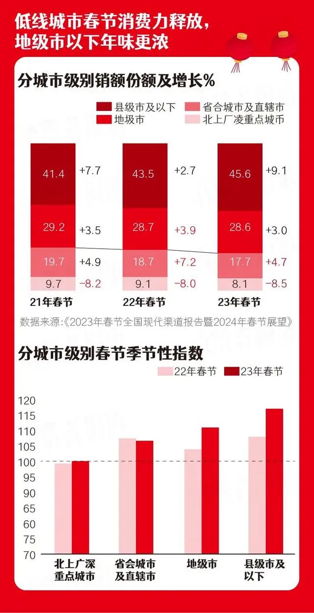 尼尔森数据显示,近三年低线城市春节的消费份额占比持续增长,2023年春节增长达到9.1%,旺季特征较往年春节也更显著,新年的氛围感更佳强烈。反之,高线城市销售相对冷清,持续两年市场份额萎缩,年味淡薄。