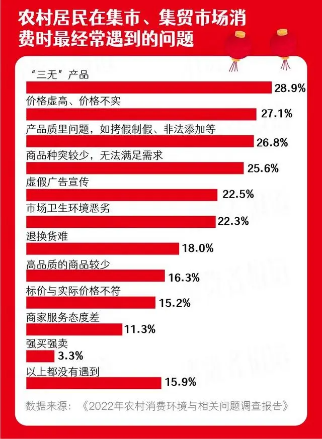 中国消费者协会结合连续三年开展的农村集贸市场调查体验活动以及调研发布的《2022年农村消费环境与相关问题调查报告》结果显示,农村居民在集市、集贸市场消费时最经常遇到的是“三无”产品问题,占比达28.9%;其次较为常见的问题是价格虚高、价格不实问题,占比为27.1%;掺假制假、非法添加等产品质量问题也经常发生(26.8%)。相较之下,商超百货明码标价、产品种类繁多,品质也更有保障。