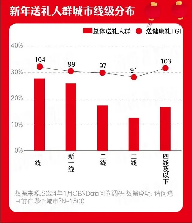 这也决定了在春节置办年货时,送礼占据消费大头。CBNData发布的《2024新年送礼趋势洞察》显示新年礼物支出在小镇人收入中的占比近四成,相较都市人更高一些。