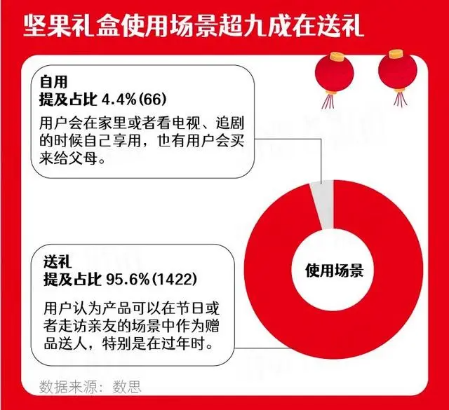 除了健康,还综合了价格、品牌、实用性等优势的坚果礼盒成为年货礼包中的热门选项。数思数据显示,2024年坚果礼盒品牌中,百草味品牌声量排名第一,近30天内销量超过300w,三只松鼠坚果礼盒排名第二。从消费者画像来看,百草味坚果礼盒的主力消费人群主要集中在三线城市,超九成消费者的使用场景都集中在送礼。三只松鼠坚果礼盒也呈现出同样的趋势。
